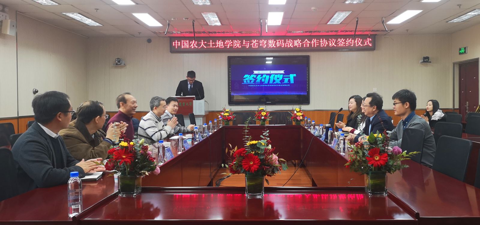 中國(guó)農(nóng)業(yè)大學(xué)土地科學(xué)與技術(shù)學(xué)院書(shū)記劉尚民、副院長(zhǎng)楊建宇、副院長(zhǎng)曹兆紅、學(xué)院地理信息系主任黃健熙、高秉博教授、姚曉闖老師以及蒼穹數(shù)碼總經(jīng)理趙曉方等出席簽約儀式。