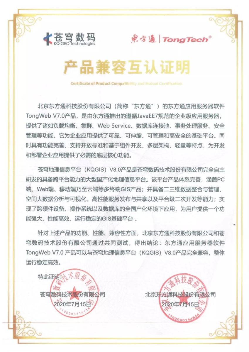 日前,蒼穹數(shù)碼技術(shù)股份有限公司的KQGIS V8.0和北京東方通科技股份有限公司(以下簡(jiǎn)稱"東方通”)的東方通應(yīng)用服務(wù)器中間件軟件TongWeb V7.0完成兼容性互認(rèn)證。