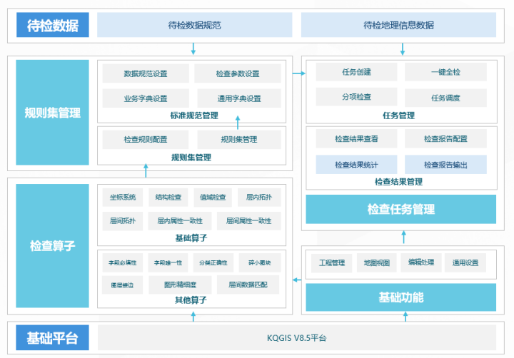 蒼穹地理信息數(shù)據(jù)質(zhì)量檢查系統(tǒng)基于KQGIS平臺自主研發(fā),旨在對各類二三維地理信息數(shù)據(jù)進行高效準確的質(zhì)檢?;诓粩喔M二調(diào)、三調(diào)和持續(xù)十多年的變更調(diào)查服務,以及持續(xù)支撐國土空間規(guī)劃、實景三維等強GIS應用,積累形成豐富的空間、屬性檢查算子,面向各類地理信息數(shù)據(jù)規(guī)范化質(zhì)量檢查要求,實現(xiàn)基于算子的檢查規(guī)則靈活配置與規(guī)則集構(gòu)建管理,對二三維地理信息數(shù)據(jù)進行高效檢查和結(jié)果輸出。
