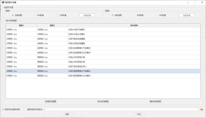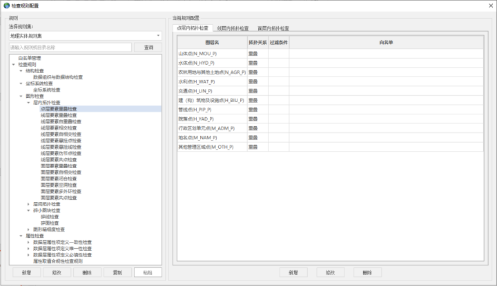 針對具體的數(shù)據(jù)檢查項目,基于系統(tǒng)提供的檢查算子,結(jié)合不同的數(shù)據(jù)規(guī)范要求,形成檢查規(guī)則集:一方面可按照數(shù)據(jù)規(guī)范明確的內(nèi)容進行配置,另一方面可結(jié)合地方特色進行本地化的規(guī)則細項配置,自由組裝形成對應的檢查規(guī)則,滿足不同業(yè)務場景及本地化需求的地理信息數(shù)據(jù)質(zhì)量核查要求。