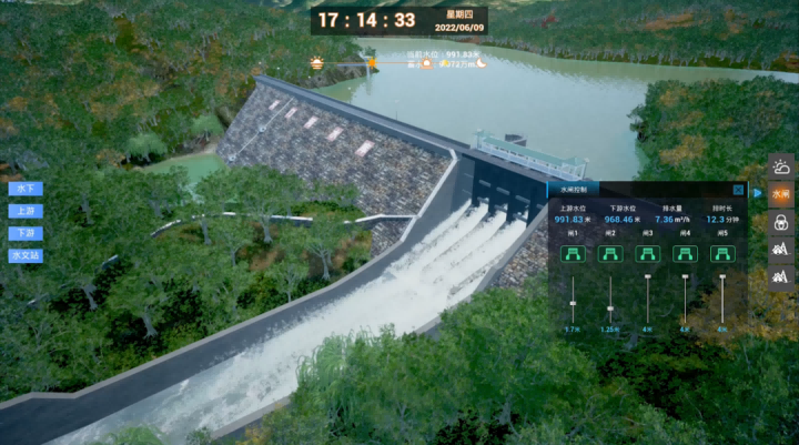 采用動(dòng)態(tài)渲染技術(shù),模擬仿真閘門啟閉、泄水、流量變化過程。與閘門自動(dòng)控制系統(tǒng)對(duì)接,遠(yuǎn)程控制閘門啟閉,達(dá)到水利工程運(yùn)行的虛實(shí)交互。