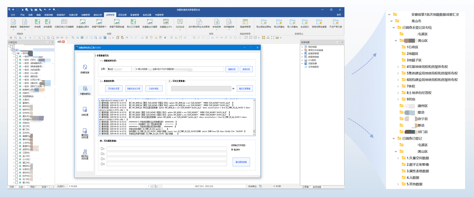 蒼穹數(shù)碼充分發(fā)揮在數(shù)據(jù)治理和質(zhì)檢匯交領(lǐng)域的深厚累積,針對(duì)黃山地籍?dāng)?shù)據(jù)庫“物理分散、邏輯集中”的管理現(xiàn)狀,快速制定了“標(biāo)準(zhǔn)模板制定—數(shù)據(jù)抽取轉(zhuǎn)換—標(biāo)準(zhǔn)成果導(dǎo)出—地籍?dāng)?shù)據(jù)質(zhì)檢—問題數(shù)據(jù)修改—離線拷貝匯交”的整體技術(shù)路線。在以國家下發(fā)的“不動(dòng)產(chǎn)地籍?dāng)?shù)據(jù)質(zhì)量檢查軟件”為質(zhì)量管控標(biāo)準(zhǔn)的基礎(chǔ)上,依托全國產(chǎn)自主研發(fā)的地籍?dāng)?shù)據(jù)庫管理軟件,對(duì)數(shù)據(jù)修改完善后一鍵式快捷導(dǎo)出標(biāo)準(zhǔn)成果包,確保每一項(xiàng)數(shù)據(jù)“查得準(zhǔn)、改得對(duì)、匯得全”。