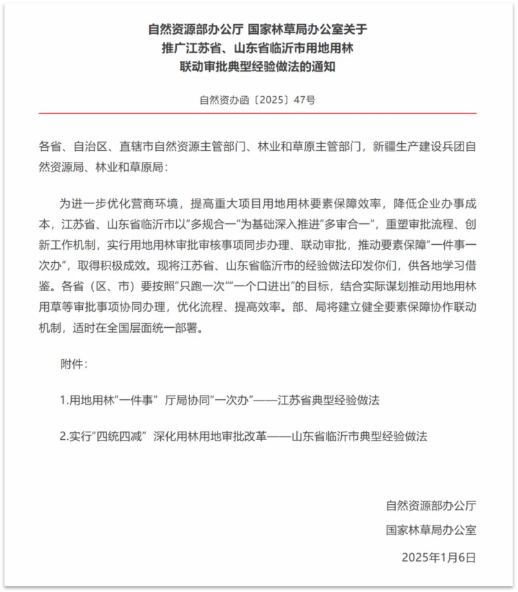 · 自然資源部辦公廳、國家林草局辦公室聯(lián)合印發(fā)《關(guān)于推廣江蘇省、山東省臨沂市用地用林聯(lián)動審批典型經(jīng)驗做法的通知》(自然資辦函〔2025〕47號),推廣江蘇省的用地用林聯(lián)動審批經(jīng)驗做法;