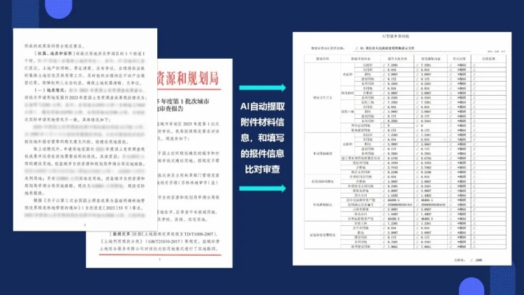在集體土地所有權(quán)數(shù)據(jù)的準入核驗時,借助DeepSeek大模型強大的知識圖譜構(gòu)建與語義理解分析能力,實現(xiàn)用地審批中被征(用)地單位權(quán)屬名稱與不動產(chǎn)權(quán)利人名稱的智能比對核驗,規(guī)避因命名邏輯不一致而造成的準入判斷錯誤問題;在報件信息審查核驗時,依托DeepSeek大模型的 OCR 識別能力與文本理解、推理能力,對組卷報件上傳的城市建設(shè)用地審查報告等附件材料開展深度解析,重點針對申報面積、地塊用途、安置情況等核心關(guān)鍵信息進行智能識別,自動提取 287 項信息要素并完成精準核驗,直接將人工審查工作量減少 80%,大幅提升審查工作的精準度與高效性。