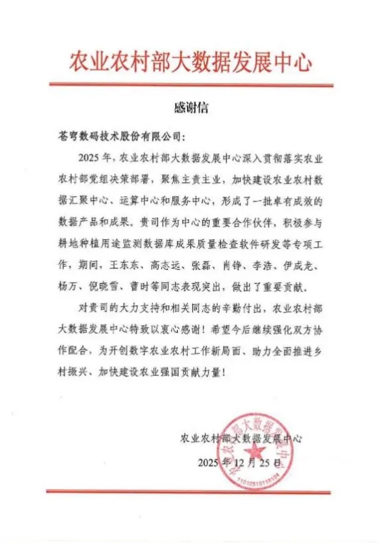 在口碑認(rèn)證方面,公司收到農(nóng)業(yè)農(nóng)村部大數(shù)據(jù)發(fā)展中心的感謝信,這充分體現(xiàn)了政府部門對雙方合作成效的高度認(rèn)可,彰顯了公司在數(shù)字農(nóng)業(yè)農(nóng)村領(lǐng)域的專業(yè)實(shí)力與服務(wù)價(jià)值。