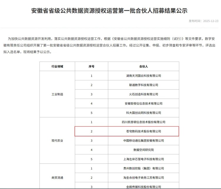 蒼穹數(shù)碼深知生態(tài)協(xié)同的重要性,2025年積極拓展合作版圖,構(gòu)建多元協(xié)同的產(chǎn)業(yè)生態(tài)。在政務(wù)合作維度,成功入圍安徽省省級公共數(shù)據(jù)資源授權(quán)運(yùn)營第一批合伙人,為探索農(nóng)業(yè)農(nóng)村公共數(shù)據(jù)價(jià)值轉(zhuǎn)化奠定堅(jiān)實(shí)基礎(chǔ);在市場協(xié)作層面,與杭州天谷信息科技有限公司(e簽寶)、杭州安鉑數(shù)據(jù)科技有限公司、數(shù)字安徽有限責(zé)任公司、江西省億發(fā)姆科技發(fā)展有限公司等企業(yè)達(dá)成相關(guān)合作,整合各方資源優(yōu)勢,實(shí)現(xiàn)技術(shù)互補(bǔ)、業(yè)務(wù)協(xié)同,共同推動(dòng)農(nóng)業(yè)農(nóng)村數(shù)字化生態(tài)產(chǎn)業(yè)的完善與升級。