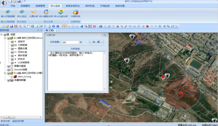 自動分析出該火源點周圍的相關(guān)設(shè)施、救援物資、救援力量以及火險隱患情況,為林火撲救提供參考。